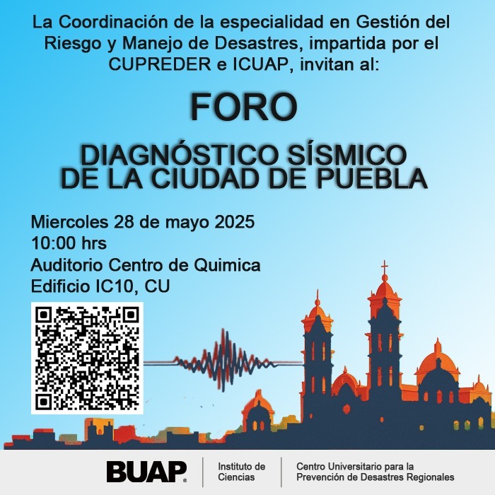 El foro fue organizado por la Coordinación de la especialidad en Gestión del Riesgo y Manejo de Desastres, la cual es impartida por el Centro Universitario para la Prevención de Desastres Regionales (CUPREDER) y el Instituto de Ciencias (ICUAP) de la Benemérita Universidad Autónoma de Puebla (BUAP).